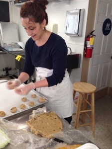 Watching cake artist Teri LaHorgue bake me cookies during lunch at Cake Is The Best Part! in Redding, CA.