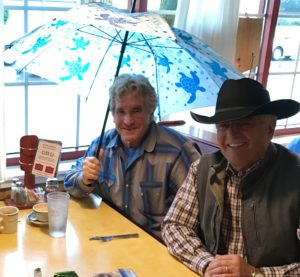 It’s pouring outside which is why The Idiot thinks it’s smart to put his umbrella up while Kevin Devine keeps his cowboy hat on during lunch at Mary’s Restaurant in Redding, CA.