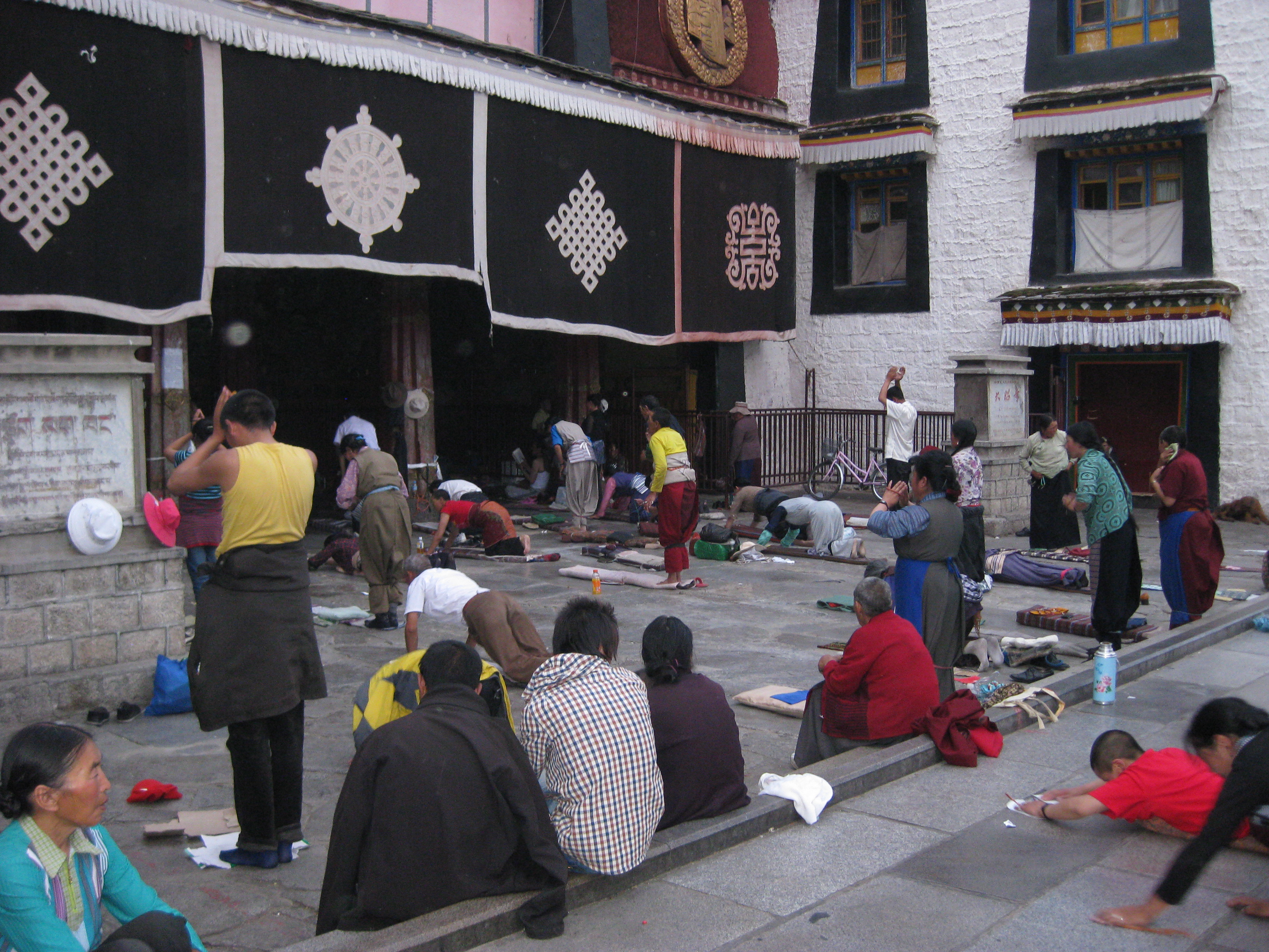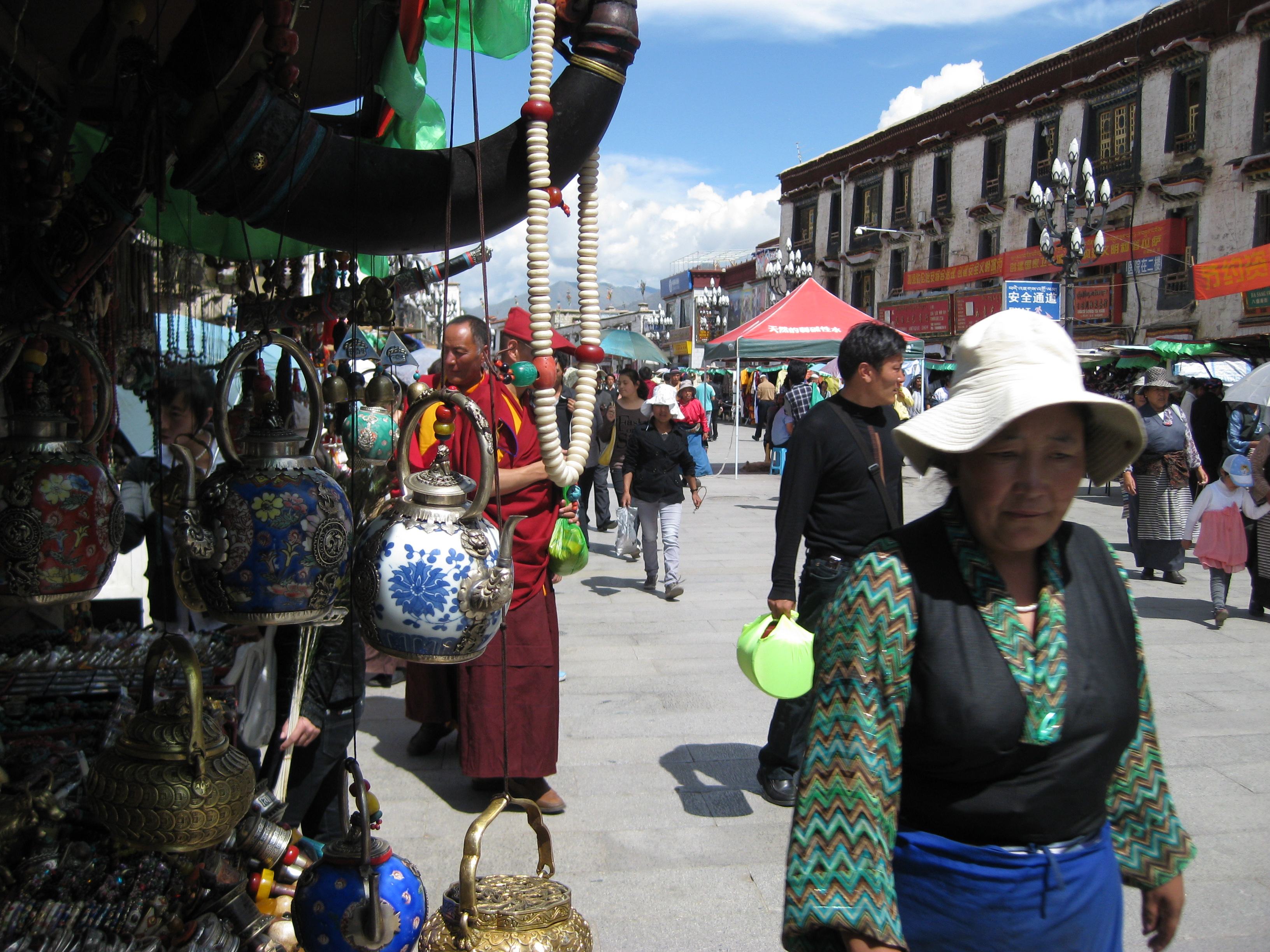 But life in Lhasa continues to buzz in the hood known as the Barkhor around the 7th century Jokhang Temple. Pilgrims perambulate, prostrate and pray while stalls, set up each day before dawn and taken down after dark, sell everything from incense, rosemary, amulets and bracelets to teapots, prayer flags, prayer wheels, tennis shoes and watermelon.